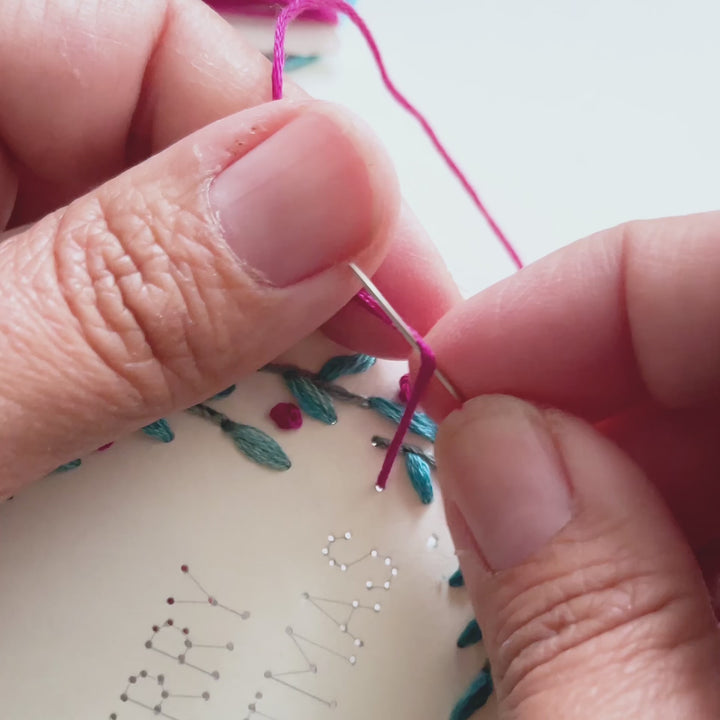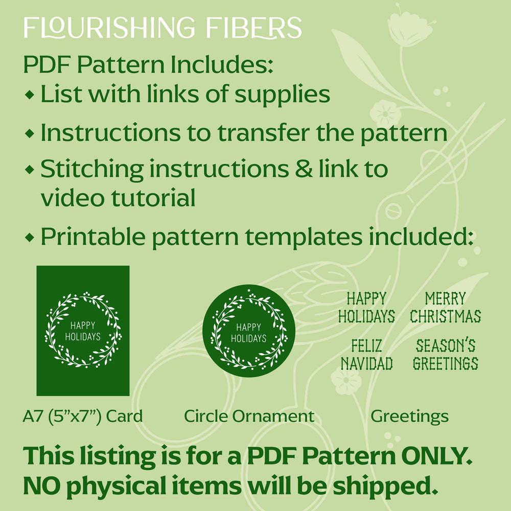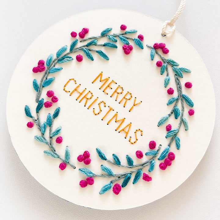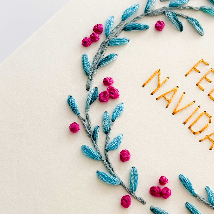 Create a modern, handmade holiday keepsake with our Berry Wreath paper embroidery pattern! This versatile pattern offers two designs: an A7 card and a circular ornament. PLUS, four festive phrases to stitch inside your wreath are also included: Happy Holidays, Merry Christmas, Feliz Navidad, and Season's Greetings.