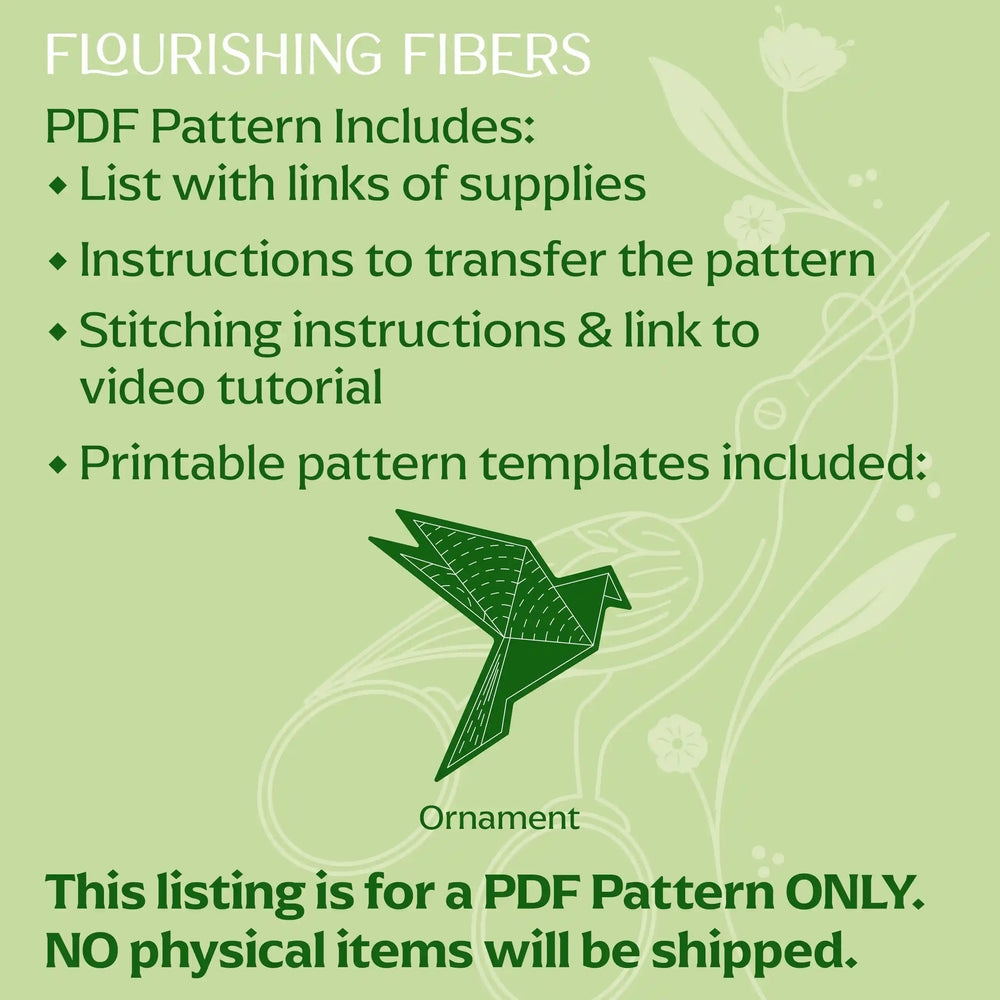 This pattern features a geometric origami-inspired dove design. Suitable for both wood and paper embroidery. Beginner-friendly, this pattern utilizes primarily straight stitches.