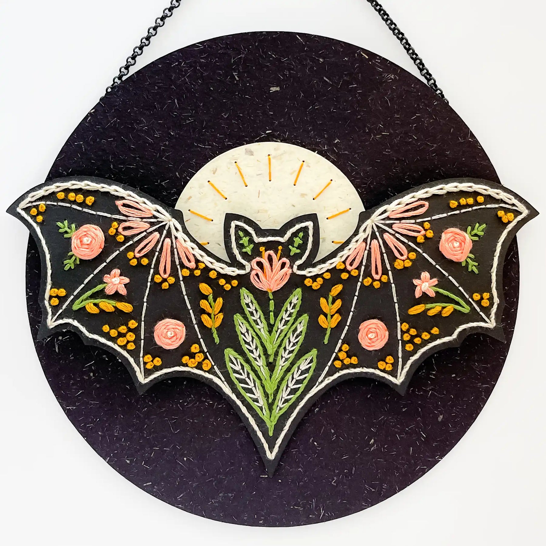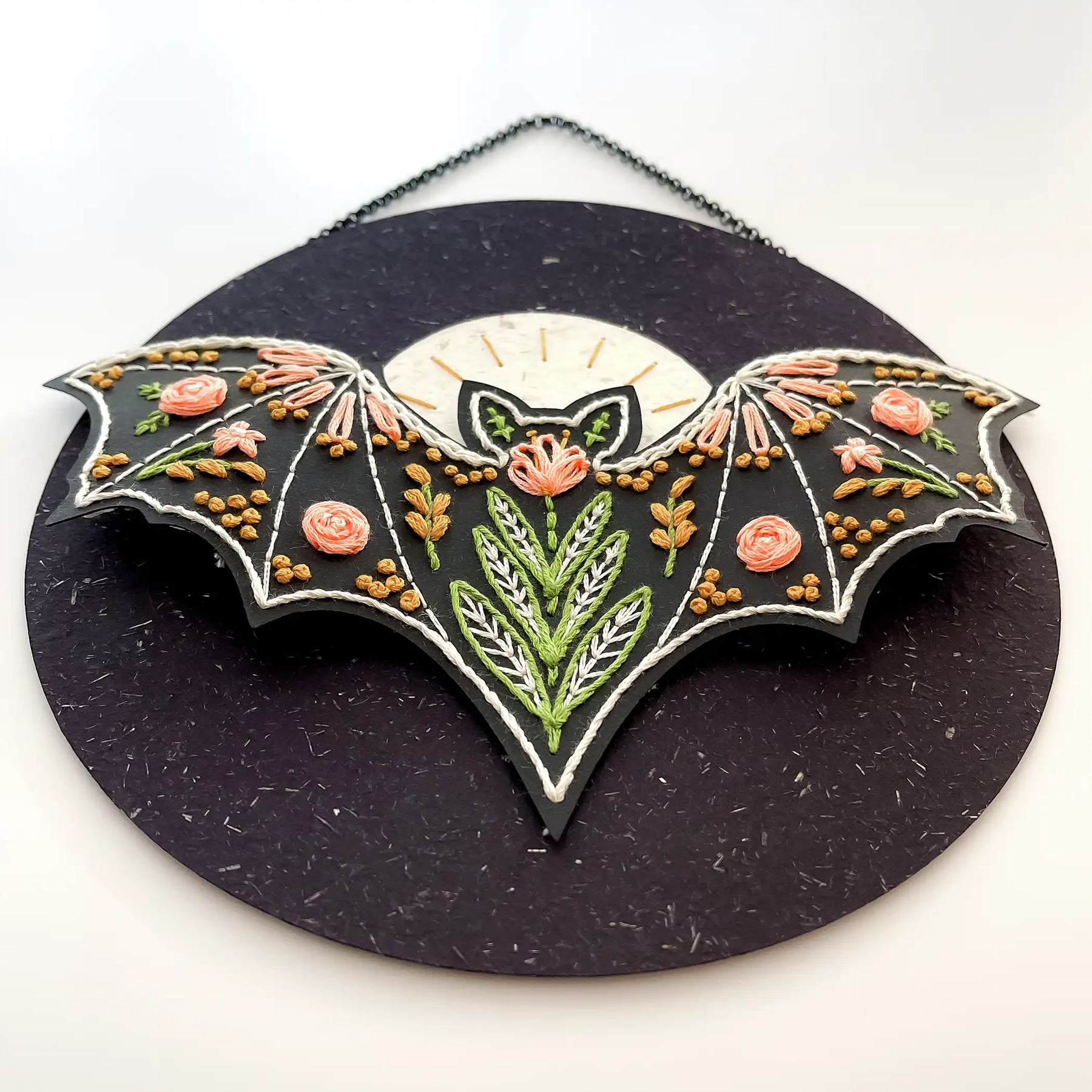 Create a stunning piece of gothic art with the "Moonlit Bat & Blooms" paper embroidery pattern. This enchanting design features an intricate floral bat against a crescent moon, perfect for Halloween decor or for anyone who loves a magical aesthetic all year round.
