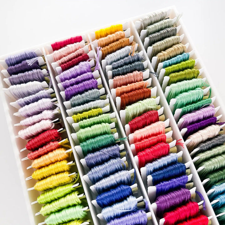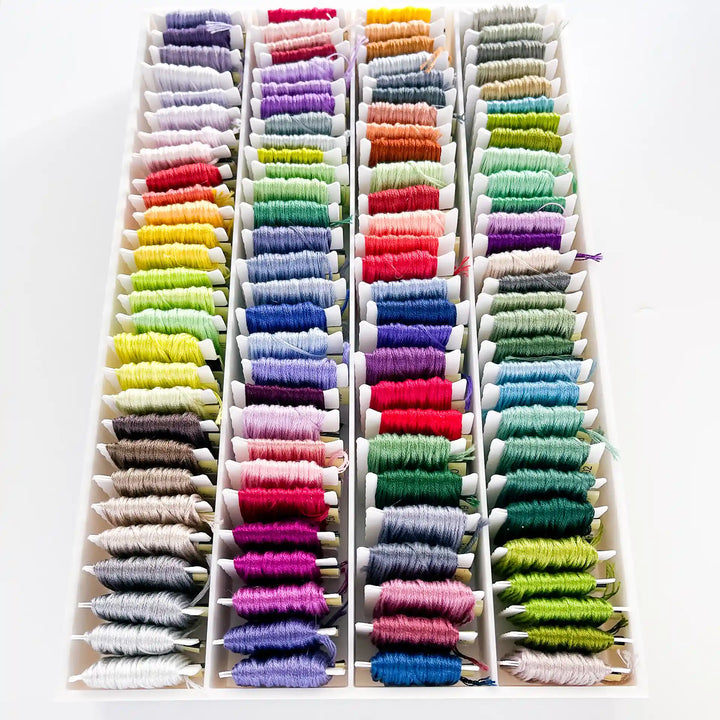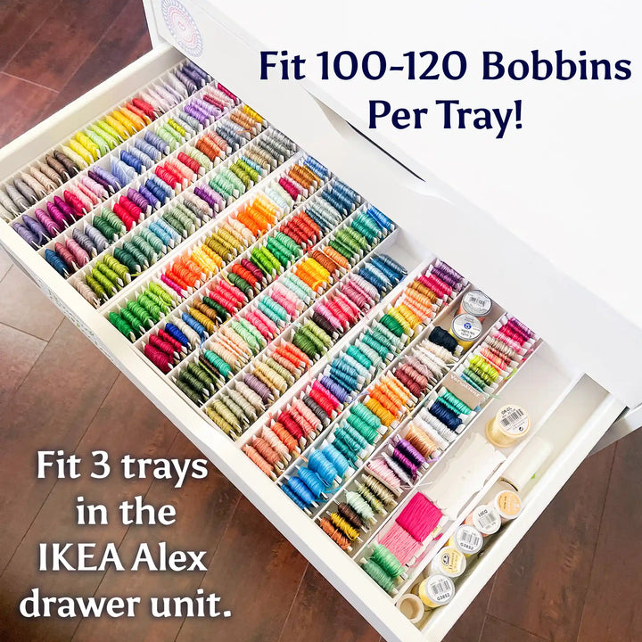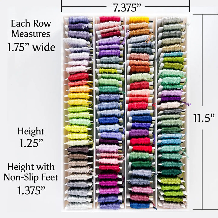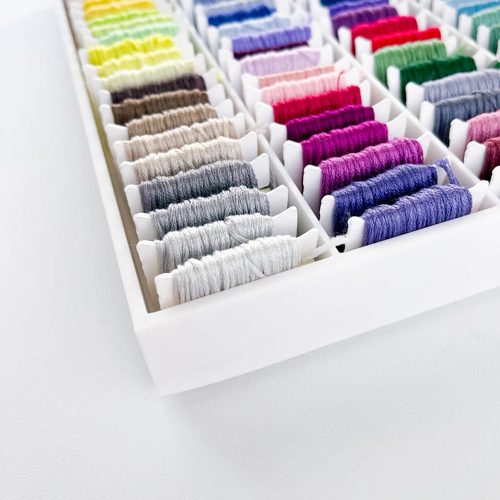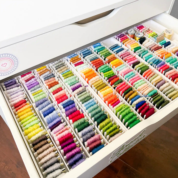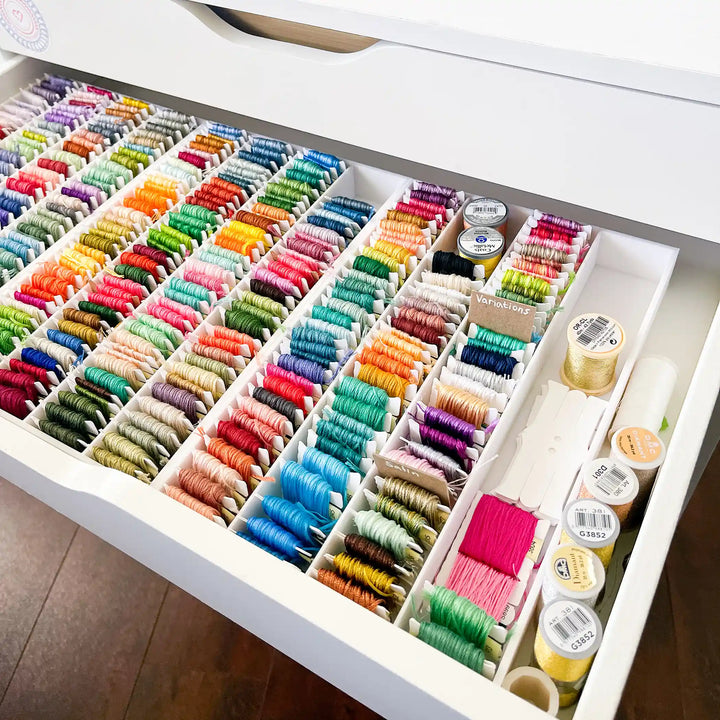 Finally, a perfect home for all your embroidery floss bobbins! Our custom 3D-printed tray organizer is designed to neatly fit in your drawer, keeping your threads tidy and within easy reach. Whether you use our innovative paper bobbins or standard sizes, this four-row tray will revolutionize your floss storage.