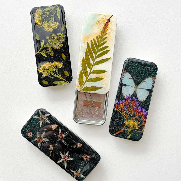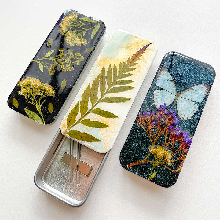 Keep all your needles in one place. This needle case is made from a lightweight tin with a removable magnet. The cover slides open and clicks shut. Each case is one-of-a-kind, making them an excellent gift for your favorite stitcher, and they can be a perfect addition to your needlecraft toolbox.
