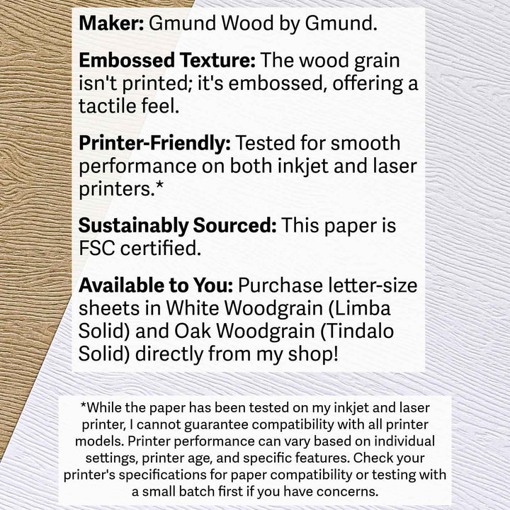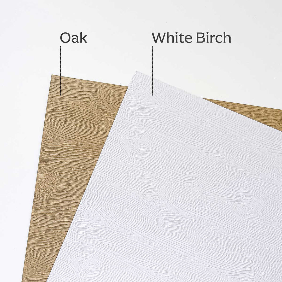 Our solid color pre-printed paper goods are crafted using high-quality Colorplan 100lb cardstock, known for its beautiful texture and durability. For paper goods with a wood grain texture, we use premium Gmund 100lb cardstock. If a different paper type or weight is used for a specific product, this information will always be clearly stated in the product description.