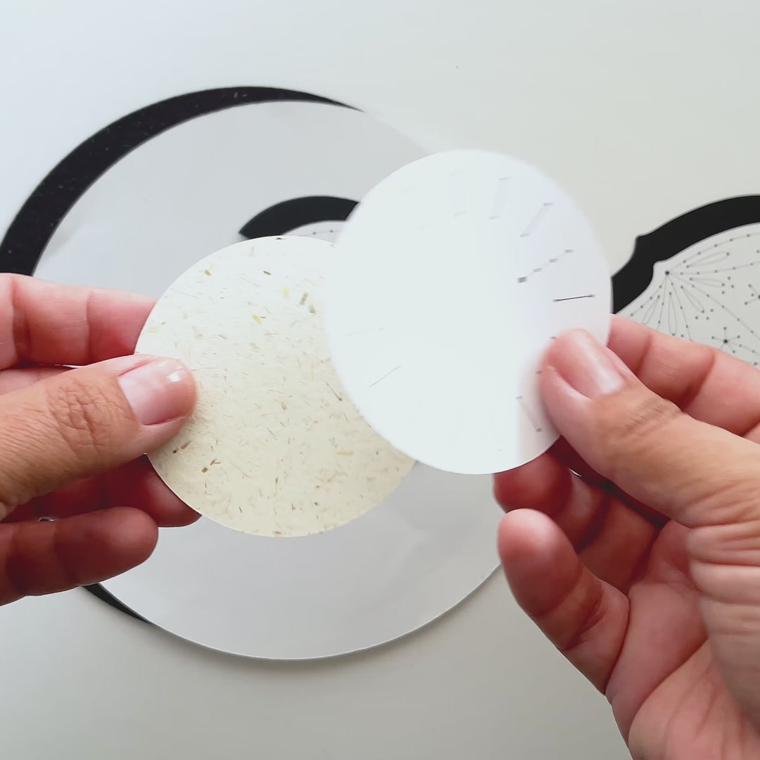 • Due to the dark, textured paper used for the final pieces, the pattern is not printed directly on them; instead, we provide pre-cut templates with the printed pattern to ensure an easy and accurate transfer of your stitching holes.