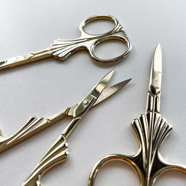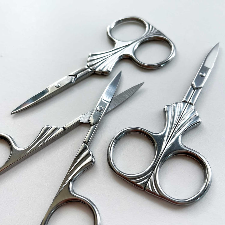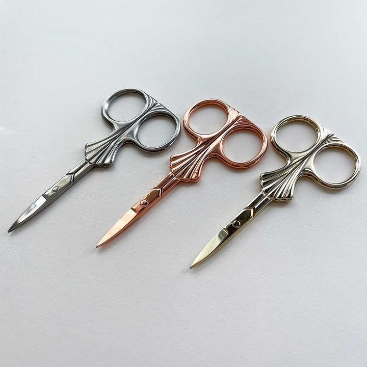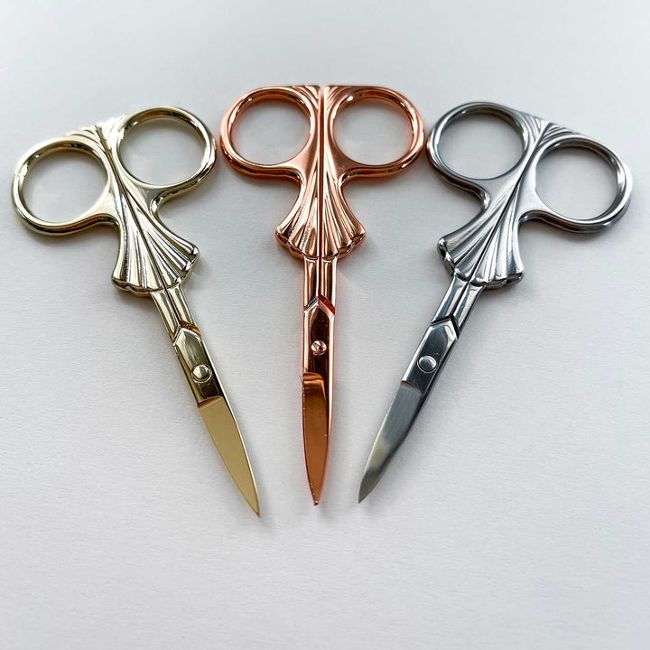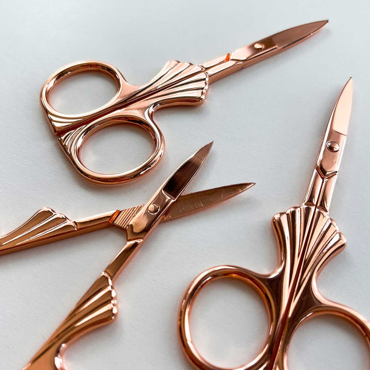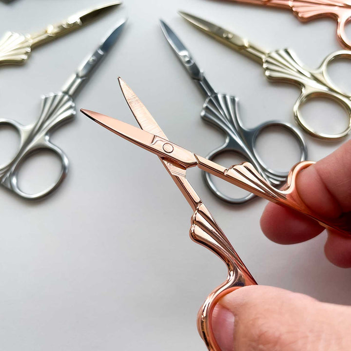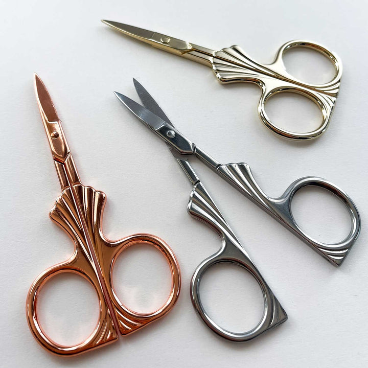 These sharp and glamorous Art Deco-inspired scissors will be the perfect addition to your scissor collection! Available in 3 finishes, Rose Gold, Gold, and Silver. PLUS, each scissor includes a tassel fob - their colors may vary from the ones pictured. Please expand each section to learn more.